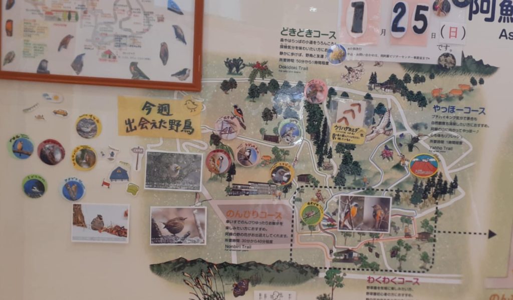 南阿蘇ビジターセンターに玄関から入ると、右側に阿蘇野草園マップがあります。 そこに見頃の植物や野鳥を展示しています。 南阿蘇自然遊歩道マップでは...