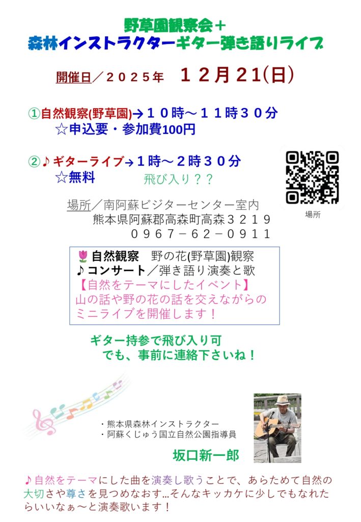 さて、12月は午前に自然観察会、午後からは森林インストラクター坂口新一郎さんによるギターの弾き語りライブをします。ギターを持参して頂ければ、飛び入り演奏OKです☆(事前に要連絡)✨飛び入り参加募集中✨