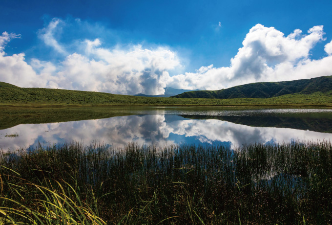 Aso-Kuju stretches across the prefectures of Oita and Kumamoto, and the sharp peaks, spacious plateaus, and abundant springs that the park is famous for were created through a series of eruptions and topological changes tens of thousands of years ago.
