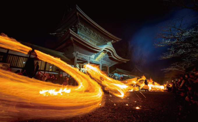 A scene from the Hifuri Shinji Festival at Aso Shrine, where participants twirl flaming bales of grass to the delight of onlookers.